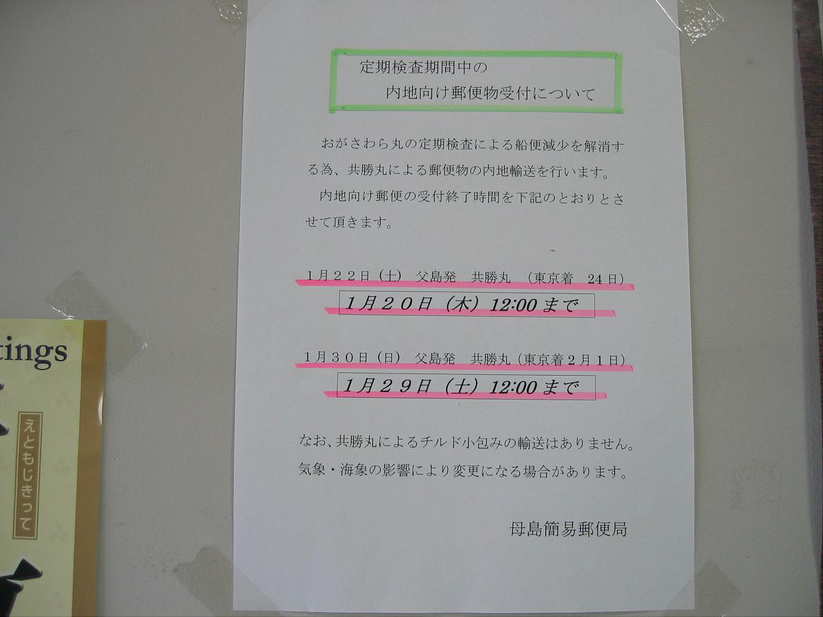 | 《17/1/26(水)》 竹芝10:00発 おがさわら丸 船中泊 《17/1/27(木)》 父島11:30着 おがさわら丸 父島12:30発、母島14:30着 ははじま丸 母島泊 民宿つき 《17/1/28(金)》 母島局めぐり(1局) 母島10:30発、父島12:30着 ははじま丸 父島局めぐり(1局) 父島14:00発 おがさわら丸 船中泊 《17/1/29(土)》 竹芝15:30着 おがさわら丸 |